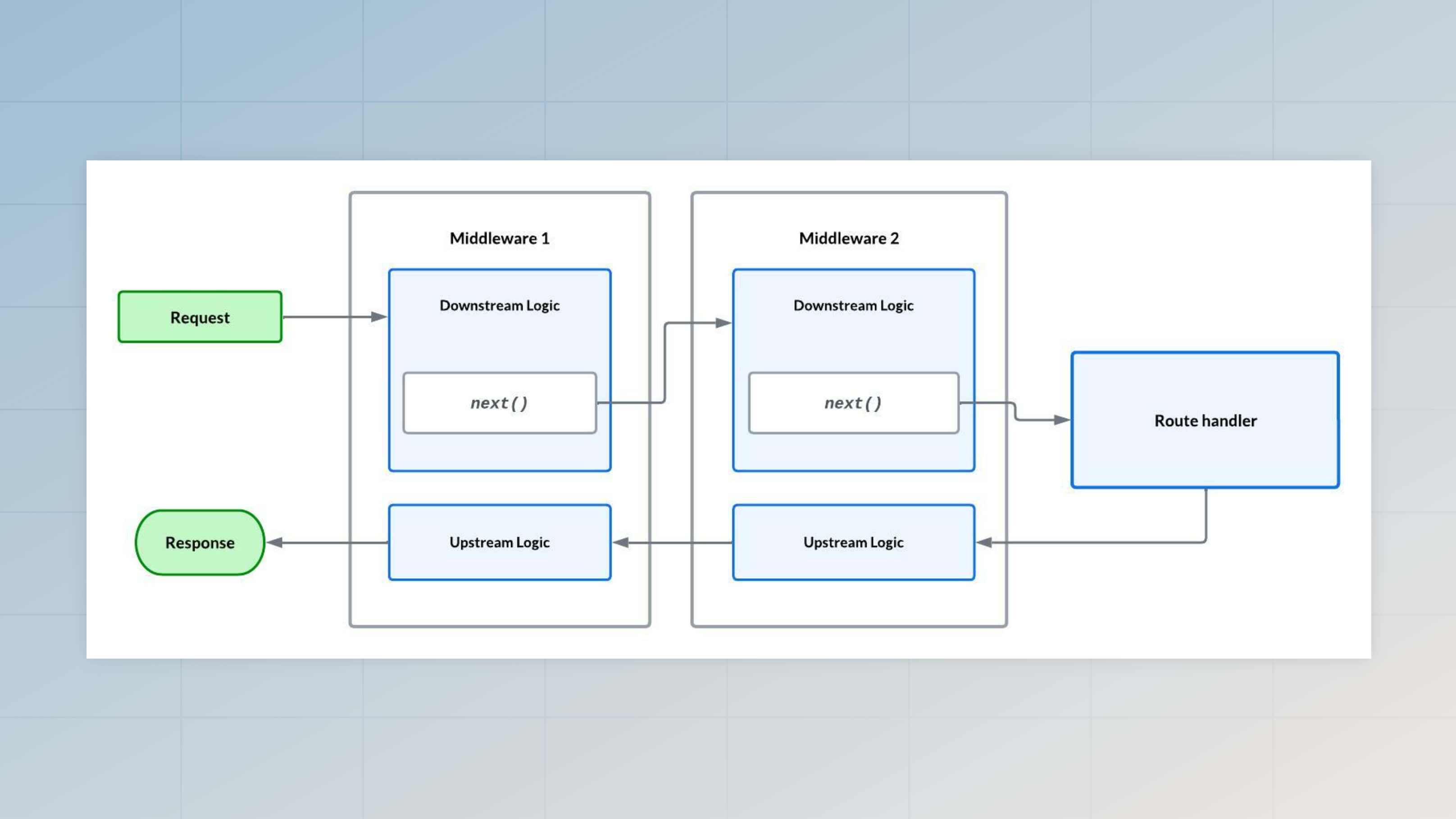 • The upstream phase is the block of code you might write after calling the next method. In this phase, you can inspect the response or change it completely.