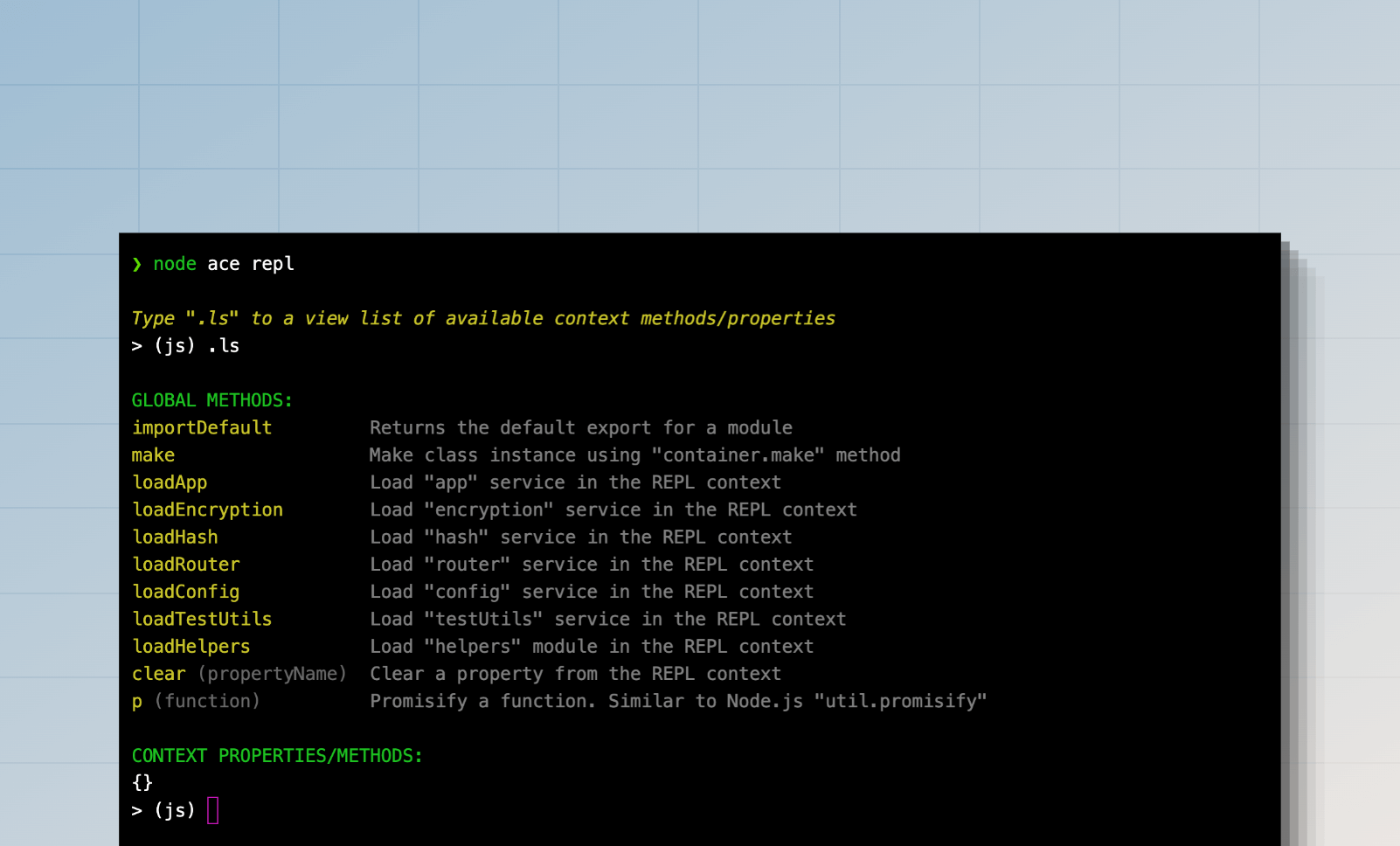 On top of a standard Node.js REPL, AdonisJS provides the following features.